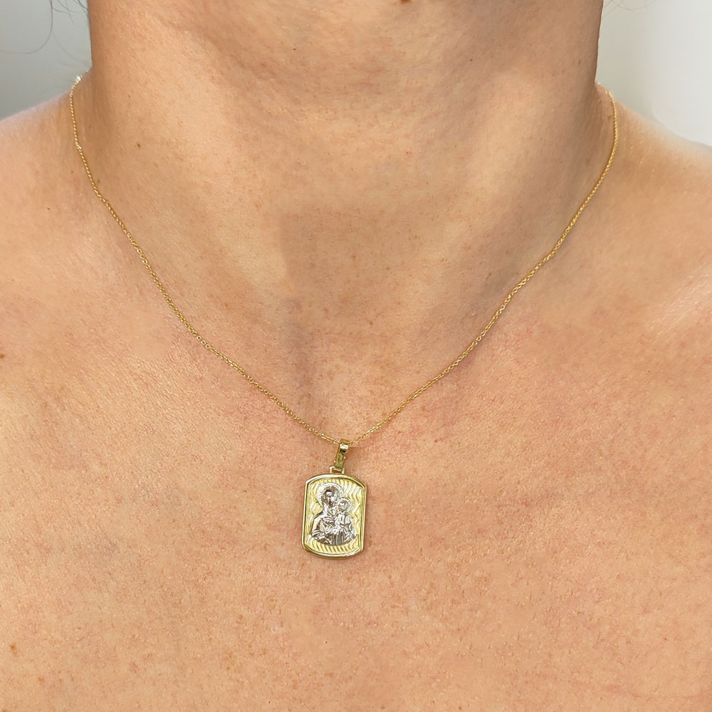 Ένα εντυπωσιακό φυλαχτό με την Παναγίτσα και τον Χριστούλι για αγόρι και κορίτσι. Είναι φτιαγμένο από χρυσό και λευκόχρυσο στα Κ14 και βάρος 1,2 γρ.