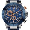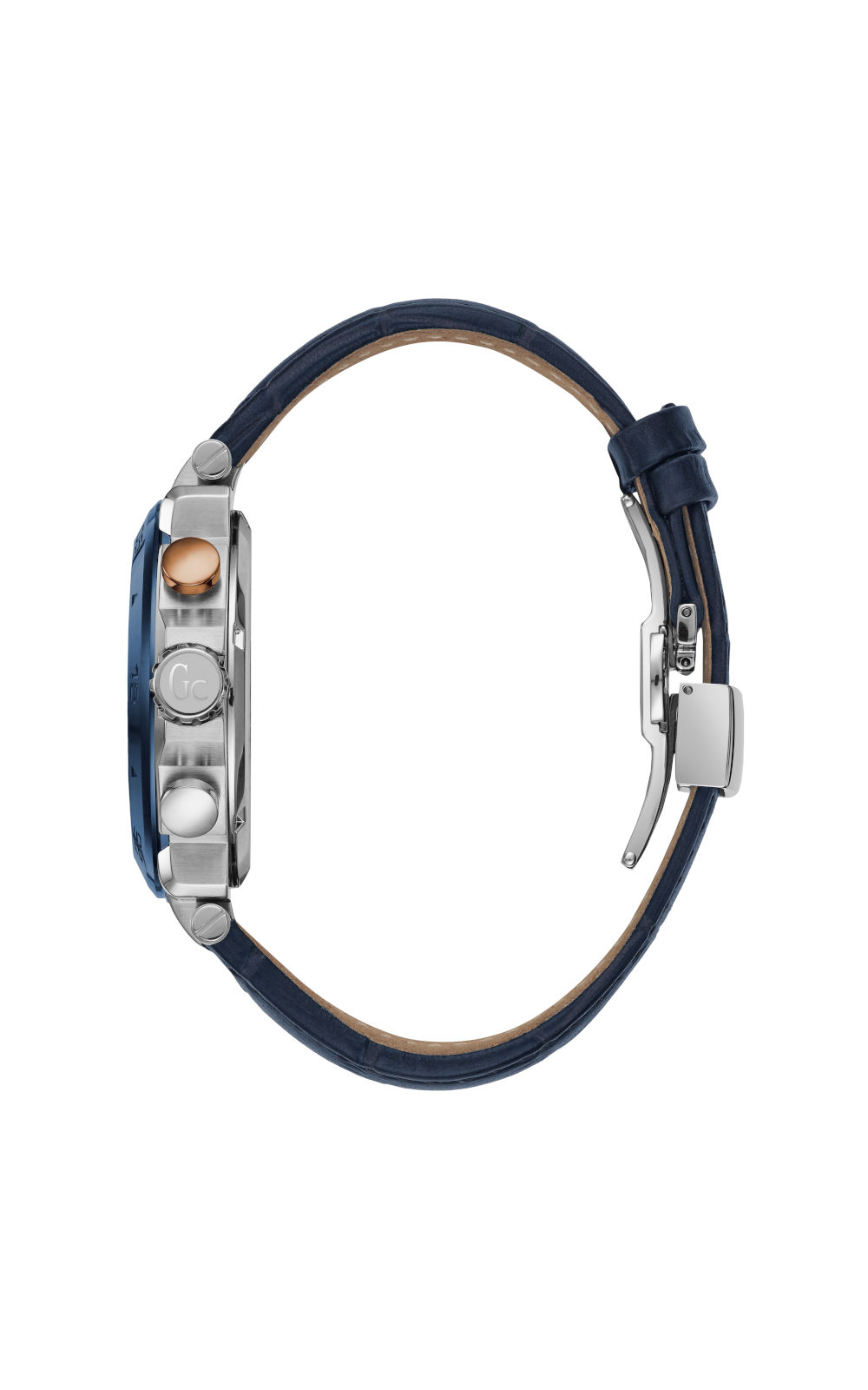 Ανδρικό ρολόι διαμέτρου 44mm, με μηχανισμό Quartz χρονογράφου ακριβείας. Έχει μπλε καντράν με ροζ επίχρυσους δείκτες – λεπτομέρειες και ένδειξη ημερομηνίας. Η κάσα του είναι από ανοξείδωτο ατσάλι μπλε χρώματος με κρύσταλλο από ζαφείρι. Έχει μπλε κροκό δερμάτινο λουράκι με κούμπωμα μπούκλας. Είναι αδιάβροχο (10 ΑΤΜ).