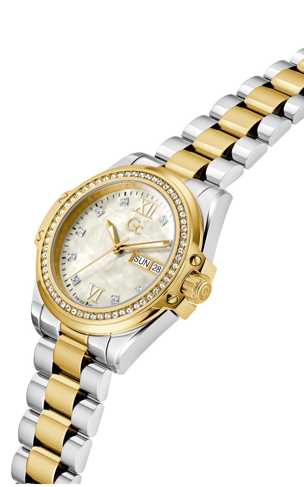 Γυναικείο ρολόι διαμέτρου 34mm, με μηχανισμό Quartz ακριβείας. Έχει χρυσό καντράν με χρυσούς δείκτες και λεπτομέρειες και ένδειξη ημερομηνίας. Η κάσα του είναι ασημένια από ανοξείδωτο ατσάλι με χρυσές λεπτομέρειες και πέτρες και κρύσταλλο από ορυκτό κρύσταλλο. Έχει ασημένιο και χρυσό μπρασελέ από ανοξείδωτο ατσάλι και κούμπωμα ασφαλείας. Είναι αδιάβροχο (10 ΑΤΜ).