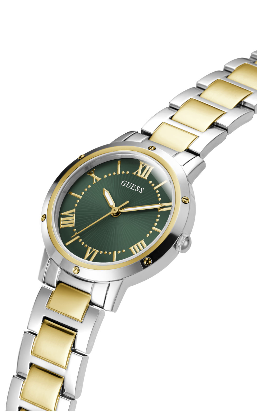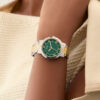 Γυναικείο ρολόι διαμέτρου 34mm με μηχανισμό QUARTZ ακριβείας. Έχει πράσινο καντράν με χρυσούς δείκτες και λεπτομέρειες. Η κάσα του είναι από ανακυκλωμένο ατσάλι με κρύσταλλο από ορυκτό κρύσταλλο ειδικής σκλήρυνσης. Έχει μπρασελέ από ανακυκλωμένο ατσάλι και κούμπωμα ασφαλείας. Δεν είναι αδιάβροχο.