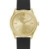 Γυναικείο ρολόι διαμέτρου 36mm με μηχανισμό QUARTZ ακριβείας. Έχει χρυσό καντράν με χρυσούς δείκτες και λεπτομέρειες και είναι διακοσμημένο με πέτρες. Η κάσα του είναι χρυσή από ανακυκλωμένο ατσάλι και έχει κρύσταλλο από ορυκτό κρύσταλλο ειδικής σκλήρυνσης. Έχει λουράκι από καουτσούκ με κούμπωμα τοκάς. Δεν είναι αδιάβροχο.