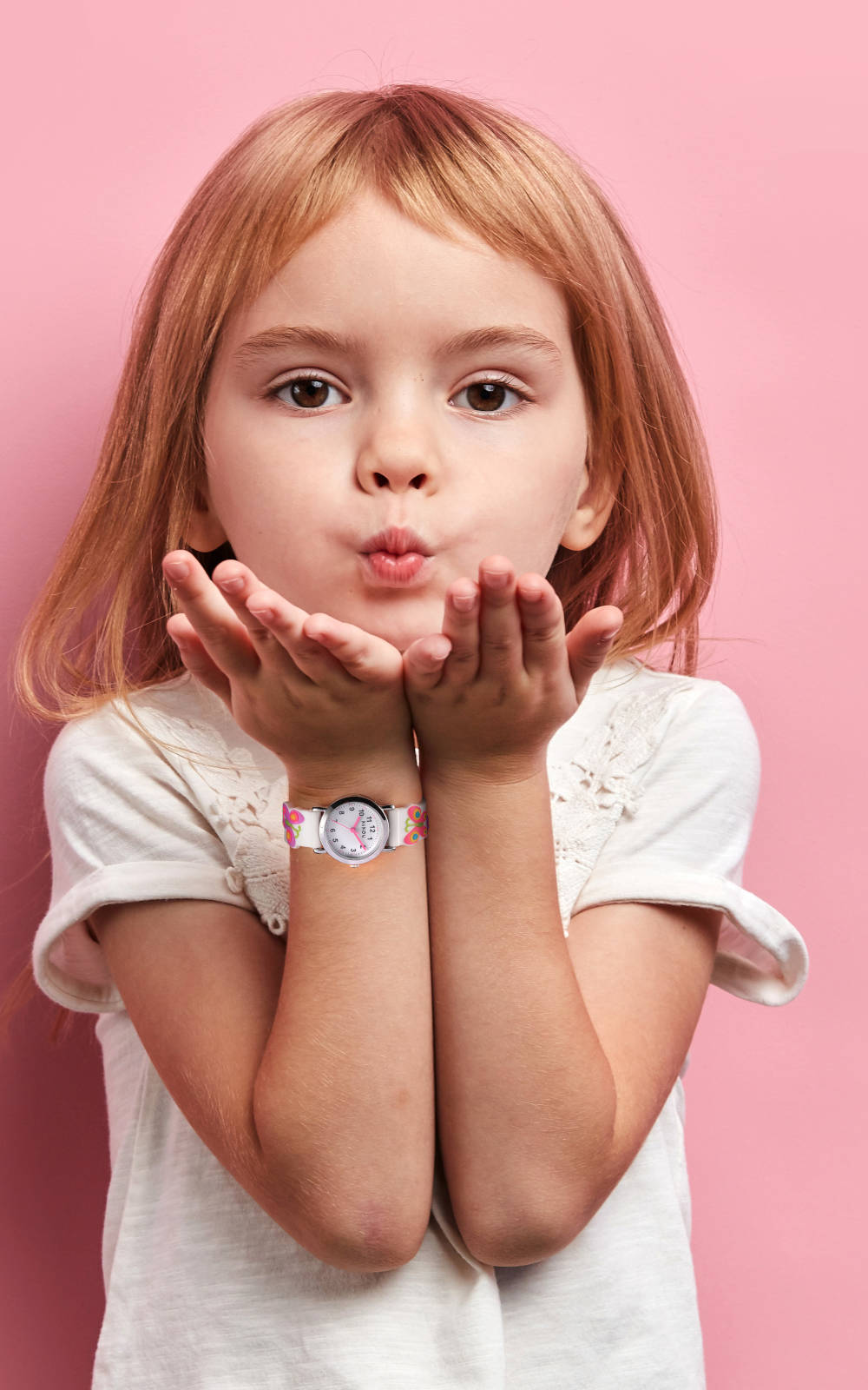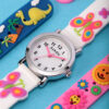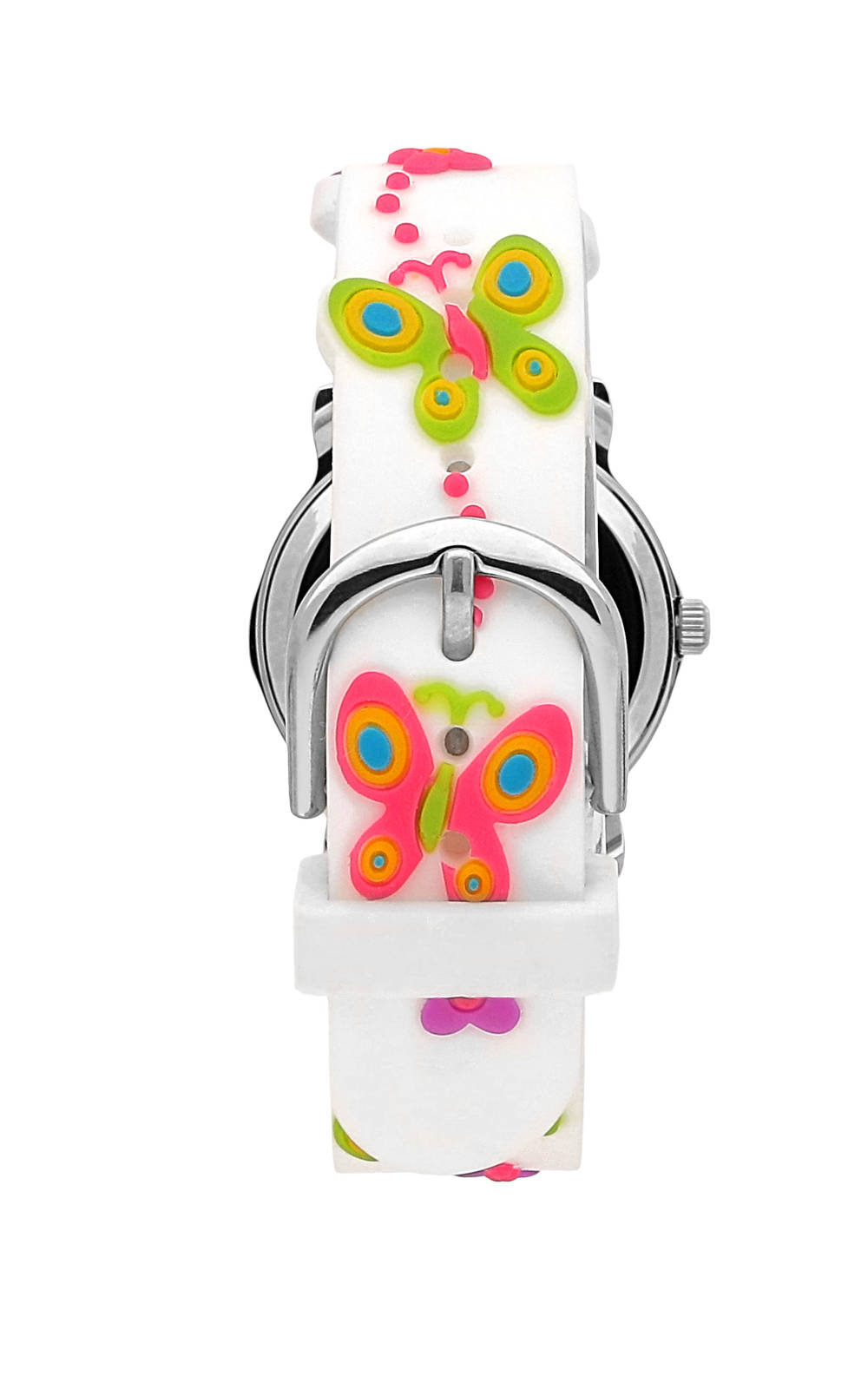 Παιδικό ρολόι διαμέτρου 26mm με μηχανισμό QUARTZ ακριβείας. Έχει λευκό καντράν με ροζ δείκτες και μαύρες λεπτομέρειες. Η κάσα του είναι μεταλλική με κρύσταλλο από ορυκτό κρύσταλλο ειδικής σκλήρυνσης. Έχει λευκό καουτσούκ λουράκι με πεταλούδες και κούμπωμα τοκάς. Δεν είναι αδιάβροχο.
