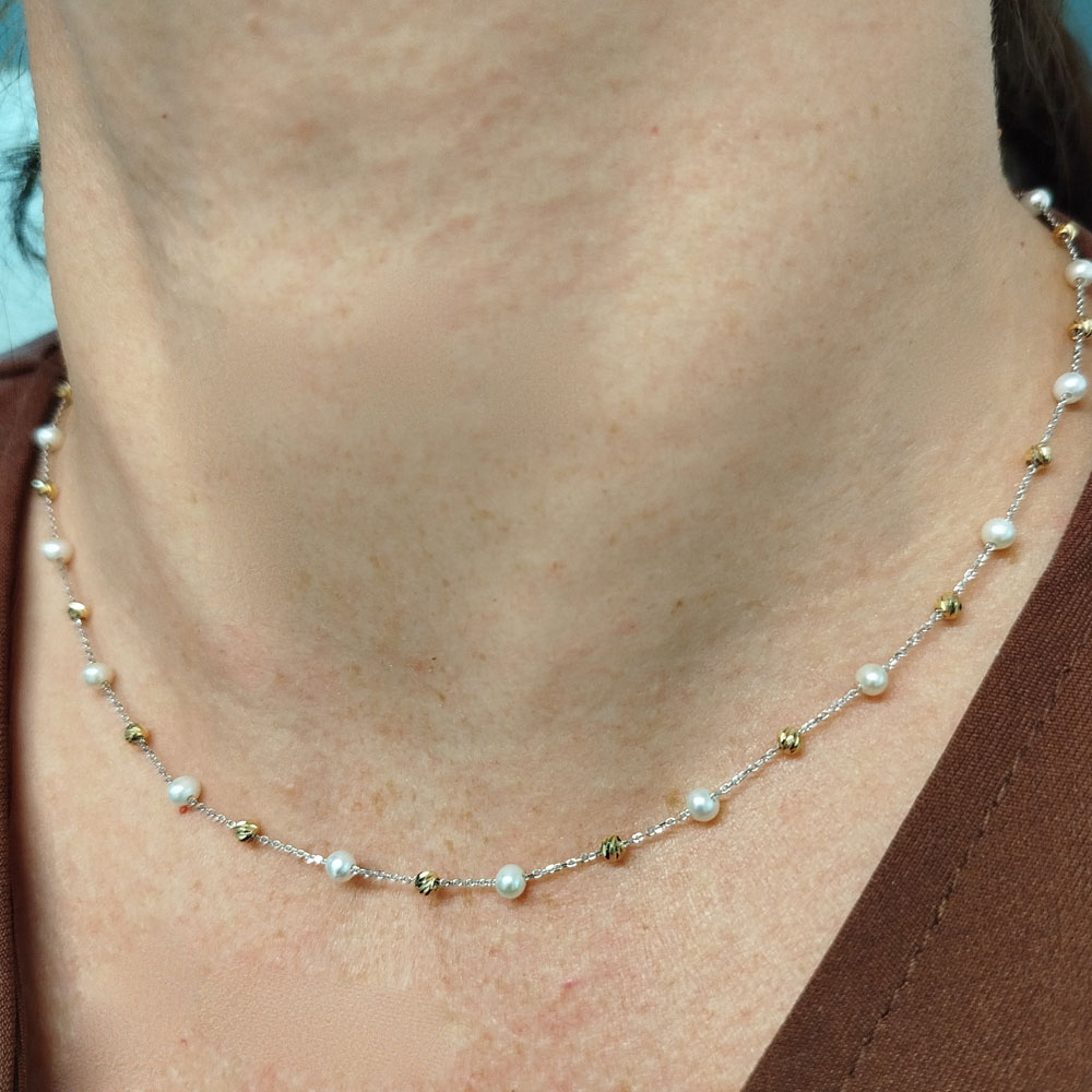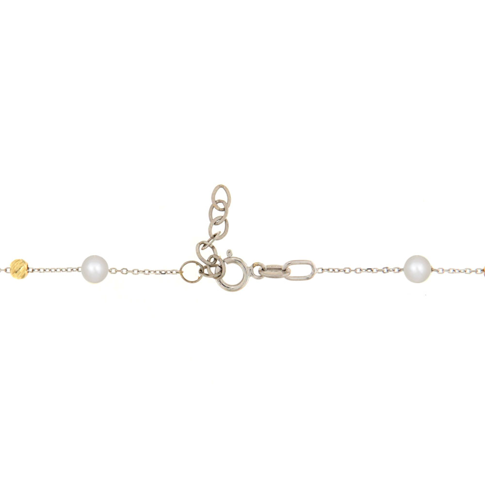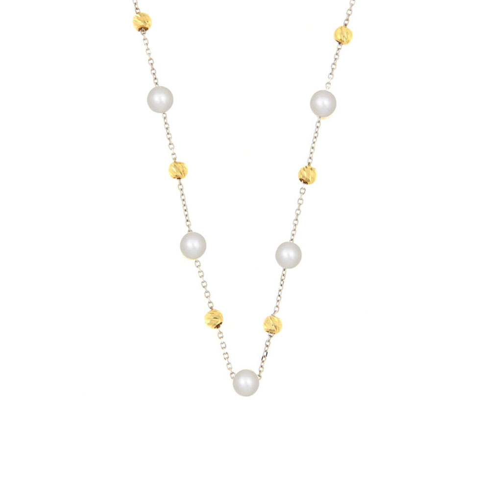 Το συγκεκριμένο κολιέ είναι φτιαγμένο από λευκόχρυσο με μικρά μαργαριτάρια αλλά και μικρές χρυσές διαμανταρισμένες μπίλιες με αποτέλεσμα να δημιουργεί ένα κόσμημα άκρως εντυπωσιακό και ξεχωριστό! Είναι φτιαγμένο από λευκόχρυσο στα Κ14, συνολικό βάρος 2,1 γρ και το μήκος του είναι 40 εκ. Εάν θέλετε να κάνετε αίσθηση είστε στο σωστό δρόμο…