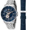 Ανδρικό ρολόι διαμέτρου 44mm με αυτόματο μηχανισμό. Έχει μπλε καντράν με ροζ χρυσούς δείκτες και διαμάντια. Η κάσα του είναι ασημένια από ανοξείδωτο ατσάλι και κρύσταλλο από ορυκτό κρύσταλλο. Έχει ασημένιο μπρασελέ από ανοξείδωτο ατσάλι και κούμπωμα ασφαλείας. Είναι αδιάβροχο (10 ΑΤΜ). Η συσκευασία περιλαμβάνει και δερμάτινο λουράκι, μπλε χρώματος.
