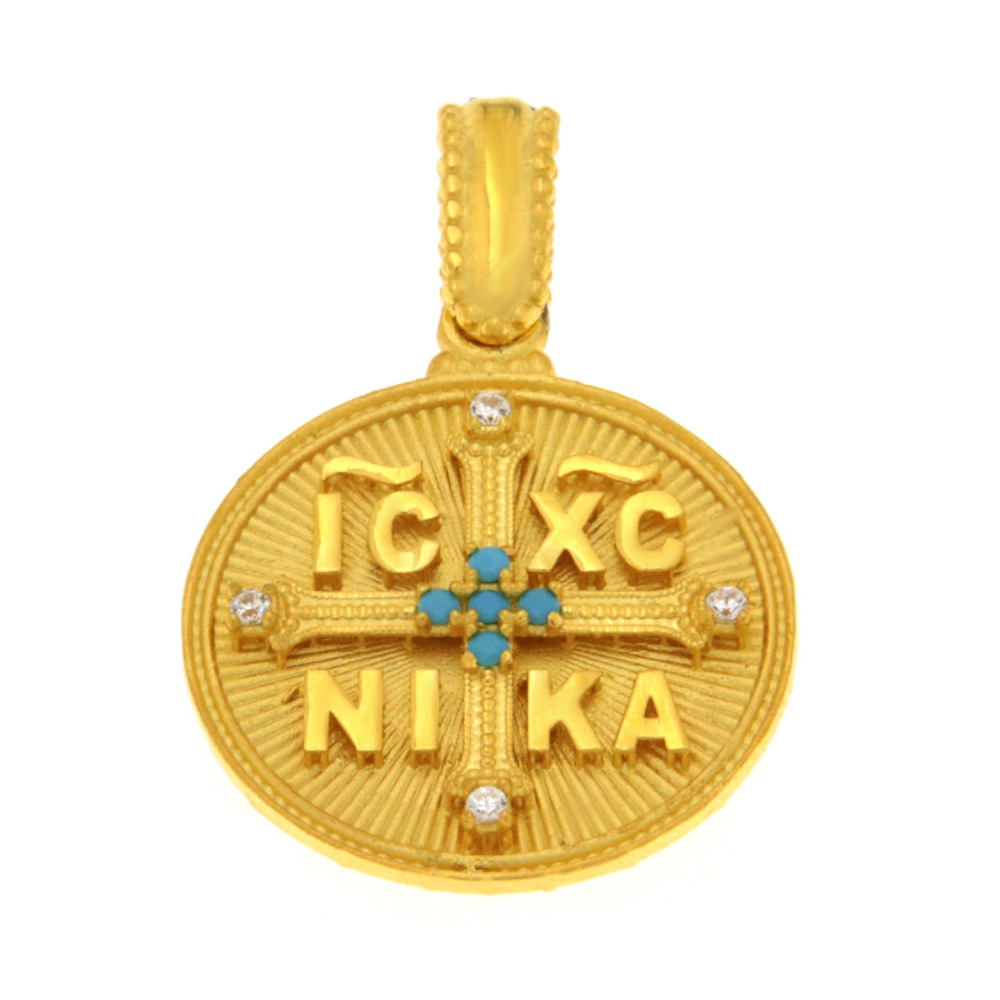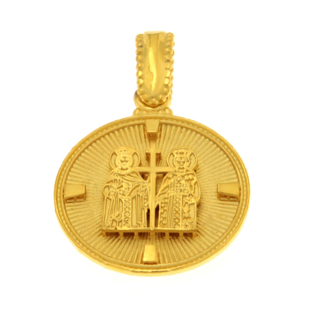 Μενταγιόν Κωνσταντινάτο διπλής όψης χρυσό, που στην μπροστινή πλευρά έχουμε το σταυρό με λευκά και γαλάζια ζιργκόν, ενώ στη πίσω όψη έχουμε τον Άγιο Κωνσταντίνο και την Αγία Ελένη σε μοντέρνα εκδοχή στα Κ9 και βάρος 1,3 γρ.