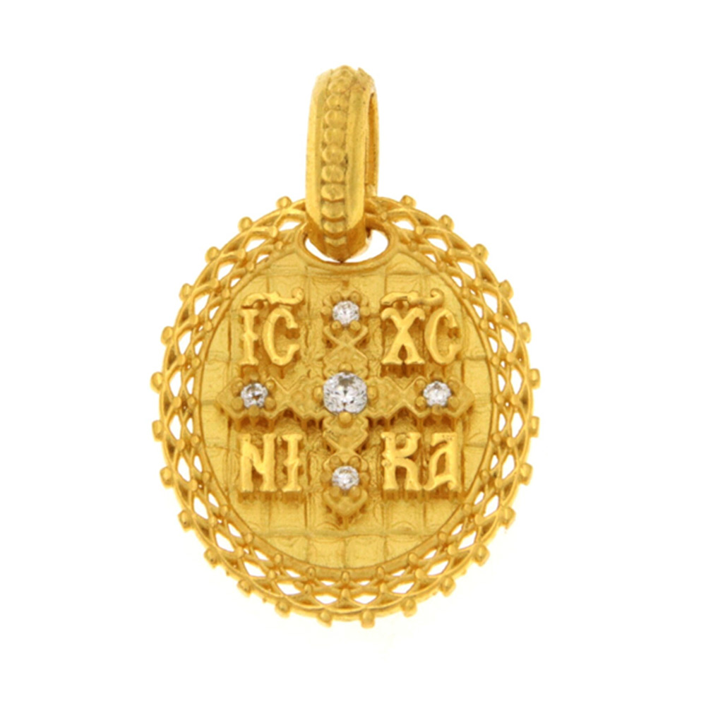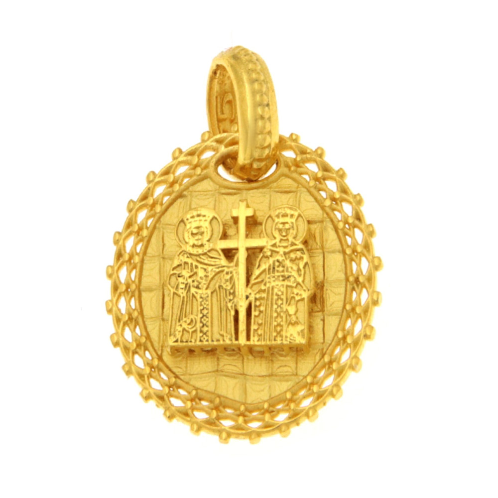 Μενταγιόν Κωνσταντινάτο διπλής όψης χρυσό, που στην μπροστινή πλευρά έχουμε το σταυρό με λευκά ζιργκόν, ενώ στη πίσω όψη έχουμε τον Άγιο Κωνσταντίνο και την Αγία Ελένη στα Κ9 και βάρος 1,1 γρ.