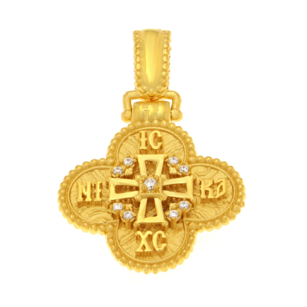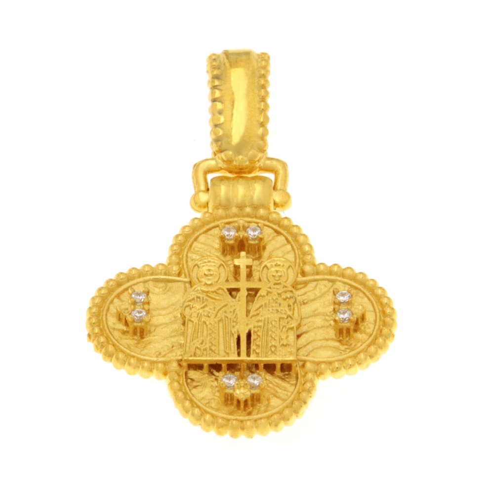 Μενταγιόν Κωνσταντινάτο διπλής όψης χρυσό, που στην μπροστινή πλευρά έχουμε το σταυρό με λευκά ζιργκόν, ενώ στη πίσω όψη έχουμε τον Άγιο Κωνσταντίνο και την Αγία Ελένη στα Κ9 και βάρος 1,45 γρ.