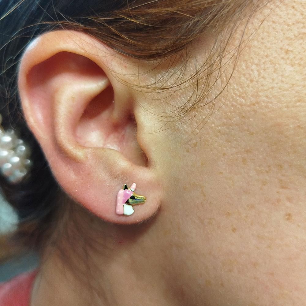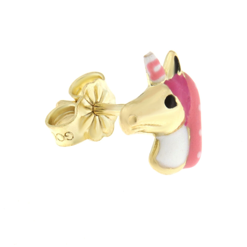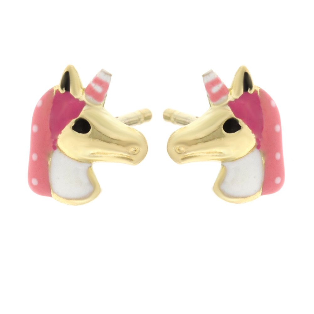 Τα συγκεκριμένα παιδικά καρφωτά σκουλαρίκια απεικονίζουν έναν μονόκερο από ψημένο σμάλτο. Είναι ένα κομψό ζευγάρι σκουλαρίκια από χρυσό στα 9 καράτια και συνολικό βάρος 0,7 γρ που θα δώσουν ένα μοναδικό στυλ στις μικρές κυρίες που θα προσφερθούν ως δώρο.